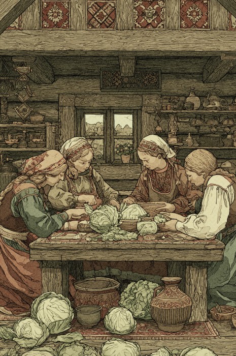 В этот период продолжали стричь и овец, а из полученной шерсти позже мастерили валенки. Хозяйки занимались заготовками на зиму — особенно капустой. Этот процесс был совместным и превращался в своего рода праздник: собирались на «капустные вечерки». Все вместе резали-солили капусту, переговариваясь и делясь историями.