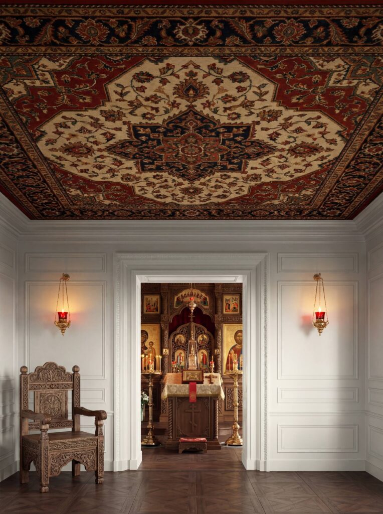 В современной квартире не всегда есть такая возможность — выбрать тот самый угол. Поэтому размещаем иконостас в восточном углу или у восточной стены. Перед самим иконостасом должно быть свободное пространство на молитву. И вот тут вы ощутите работу дизайнеров в полной мере. Он должен проникнуть всей душой в идею русского православного интерьера и спроектировать планировочное решение, учитывая не только современные решения, такие как умный дом, теневые плинтуса и тд., но и вписать красный угол для верующего заказчика. Конечно, с моей точки зрения стилистика дома и квартиры должны соответствовать. Это не означает, что теперь в вашем доме отныне будет стоять шлейф ладана, а сидеть вы будете исключительно на деревянных скамьях, но и православные мотивы должны прослеживаться в стилистике дома.